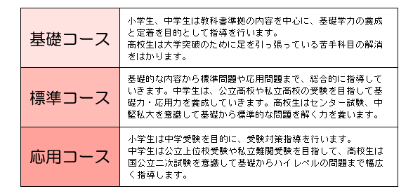 ![]() アルバイト講師はいません。 専任のプロ集団による個別指導! 大学受験の個別指導では、特に大学受験指導の経験が指導の良し悪しを大きく左右します。 「生徒さんの現状の学力に合わせて受験までのカリキュラムを組み立てます」と銘打っている個別指導専門塾のほとんどは、生徒さんの理解不足の所まで振り返って指導を始めるだけであって、肝心の受験に間に合わせることが欠けているものです。 例えば、個別指導専門塾で、次のようなことを経験したことはございませんか? ……かなり基礎的なことからやり直していく。簡単な所を学習するので順調に勉強してる気になる……高校生にもかかわらず中学生の内容を数ヶ月かけてやっと高校内容に入る……受験まであとわずか……間に合いそうにないからと回数を大きく増やすことをすすめられる……しかし、結局は志望校を下げる……これは、最初から間に合わないカリキュラムで進めていた典型だと思います。 実際に、その子に合わせて基礎的なことからスタートする事の多いのが個別指導のカリキュラムですが、大学受験に間に合わせることの意識に欠ける個別指導塾が多いのが現状です。 私たちは受験に間に合わせるためにあなたを鍛えます。 大学受験でつちかわれた豊富な経験が私どもの大きな武器です。大学受験、高校受験、中学受験とも、私たちの個別指導は受験に必要なレベルアップに全力を傾けます。 「入試に即した的確な指導」、「客観的な学力診断」、「最新の受験情報の提供」など、卓越した独自の指導システムで生徒の皆さんを力強くバックアップします。 入会時に実施するカウンセリングで、学習する科目や単元、受講曜日と時間帯、そして指導パターンとコースを決めます。理解度の異なる生徒さんが自分の目標を達成するためのカリキュラムですから、 当然オーダーメイドのカリキュラムで対応します。 個別指導の基本個別は先生1人対生徒2人のスタイルです。 ご家庭、生徒本人と学習の方向について話し合い、その生徒さんの状態と目的に合わせたカリキュラムを組みたて指導していきます。たとえば、苦手教科の克服を目的に通う生徒さんには、わからなくなったところから学年をさかのぼって基礎を徹底的に指導していきます。また、得意科目をのばす目的の生徒さんには、学年の枠を飛び越えた幅広く応用の効く学習計画を組み立てます。 上記の基本個別以外にも、1対1の完全個別指導が選択できます。1人の生徒に1人の先生がつきます。いつでも何でも質問して下さい。あなたのためだけの授業です。各家庭のご希望にあわせて対応させていただきますので、気軽にお申し付けください。 なお、以下のコースは、生徒さんのその後の学習状況によって変更が可能です。 ![]() 料金表 料金表は基本プランです。ご友人などとオーダーメイドの授業を設置する事も可能です。 |
